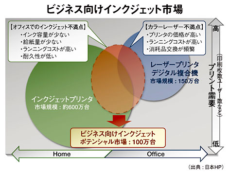 SOHOや中小企業向け国内プリンタ市場にインクジェット機が台頭してきそうだ。企業内で使われている家庭用インクジェット機などの代替機として需要が見込めると判断し、セイコーエプソンや日本HP(ヒューレット・パッカード)などが、ここへきて相次ぎビジネスインクジェットプリンタの新製品を発売。販売会社や家電量販店での拡販を強化している。日本HPは「数年内に年間100万台規模に達するポテンシャルがある」と見込む。ページプリンタ市場が伸び悩むなかで、需要を喚起する新たな商材として注目されそうだ。