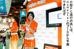 Computexでのトレンド商品は会場をちょっと回ってみれば分かる。今年の要注目商品はPDAと超小型ノートPCの中間に位置づけられる、車載(モバイル)を考慮したPCであろう。こうした傾向をつかむのは極めて重要である。試作品ならともかく、すでにかなりの資本を投じて製品化しているので、売れなかったでは済まされない。このためトレンドづくりに始まり、かなりな大仕掛けで製品販売を企画している。この製品は半年後から1年後にはほぼ間違いなく日本で販売が開始されると思ってよい。
