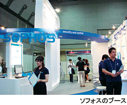 情報漏えい対策製品などを手がけるソフォス(アラン・ブロデリック社長)はDLP展示スペースのすぐ近くに出展。同社もSkyと同じく、入場口近くのスペースに陣取っている。マーケティングスペシャリストの中川雅子氏も「今年は夏になってしまったので、お休みに入っている人も多く、来場者は少ない」と感じる一方で、「DLPについて聞くためにお客さんがブースを訪れている」と一定の手応えを感じている様子だ。