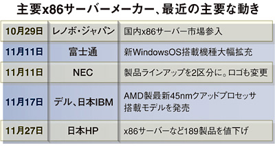 市場は6年ぶりの冷え込みに 初冬に入って、x86サーバー市場で有力メーカー各社の動きが慌しくなってきた。11月、NECは既存商品のラインアップ体系の見直しを図り、日本ヒューレット・パッカード(日本HP)は同月下旬に値下げを断行。一方、新規参入者も現れた。レノボ・ジャパンが10月下旬に国内x86サーバー発売にこぎ着けたのだ。攻勢をかけるメーカー各社――。ハードウェアのなかでも堅調に推移していたx86サーバーだが、景気後退の煽りを受けて今年度は台数・金額ともにマイナス成長に転じる可能性が高い。メーカーの言動には苦しさも滲み出ている。(木村剛士●取材/文)