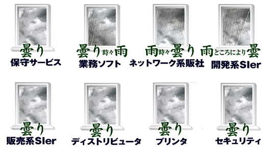 ネットワーク系販社には、引き続き「雨」マークがつく。08年は一時、SaaSなどオンデマンドビジネスやNGN(次世代ネットワーク網)に関連する機器需要が伸びる兆しを見せたものの、「世界同時不況」でIT投資を控える企業が増えると憂慮するNIerが多い。とはいえ、明るい材料もある。仮想化環境の提供やIPテレフォニーなどの積極的な提案で、この不況を打開しようとする動きも見られるからだ。