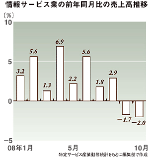 サスペンド案件が表面化 経済産業省の特定サービス産業動態統計による2008年9月の情報サービス業の売上高は前年同月比で9か月ぶりのマイナス成長になった。10月も引き続き前年同月を下回っており、開発系SIerにとっての受注環境は「月を追うごとに悪化している」(SIer幹部)と切実だ。NTTデータの山下徹社長は、「2009年問題と世界同時不況が重なったことで、単月ベースでみて最悪マイナス5%程度の落ち込みは覚悟すべきではないか」と受け止めている。