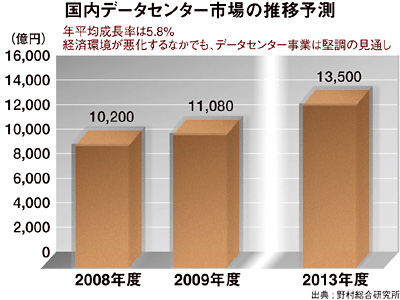 サービス事業の拡大を急ピッチで進めるキヤノンITSは、グループ再編やM&Aを積極的に展開する。経済情勢が厳しさを増すなか、とりわけ製造業の大規模な基幹業務システムの開発プロジェクトが減少する可能性があると、同社では見ている。そこでコスト削減効果が大きく、不況に強いサービス事業を拡充することで逆境を克服する構え。野村総合研究所ではサービス事業の基盤となる国内DC市場が年間平均で5.8%伸び、2013年度には1兆3500億円に達すると予測。中堅企業では運用コストの削減に向け、基幹業務システムを一括してアウトソーシングする需要が高まっており、こうした需要を掴む。