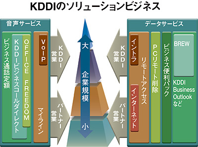 KDDI(小野寺正会長兼社長)が新サービスで法人事業の拡大に乗り出した。第一弾としてFMC(移動体通信と有線通信の融合)サービス「ビジネスコールダイレクト(BCD)」を4月から提供開始する。このほかにも、マイクロソフトのシステム基盤「.NETフレームワーク」で開発したアプリケーションを携帯電話「au」で動かせる「.net by au」の提供などにより、法人顧客を増やす方針だ。これらの施策で新規顧客として中堅・中小企業(SMB)を増加させるとしているが、法人開拓に実績のない同社がどこまでやれるのかは未知数なところがある。