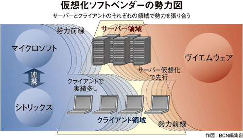 ヴイエムウェアはサーバー領域で地歩をさらに強固にし、クライアント領域でのシェア拡大を重点施策に掲げる。対するシトリックスはクライアント周りの技術に強みを持ち、アプリケーションソフトやデスクトップの仮想化で人気が高い。サーバー領域においても「機能的にライバルとなんら遜色ない」(山中本部長)と、攻略に自信を示す。マイクロソフトは(非仮想化の)クライアントとサーバーのOS分野で高いシェアを保有していることから、中小企業などすそ野の広い市場を狙えそうだ。