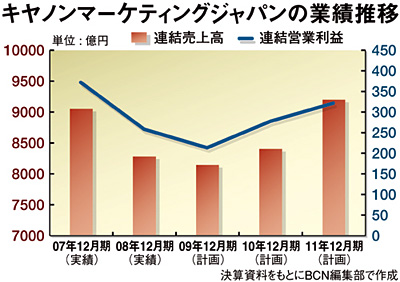 連結売上高1兆200億円が8400億円にダウン――。キヤノンマーケティングジャパン(キヤノンMJ、村瀬治男社長)は、3か年経営計画を大幅に下方修正した。世界同時不況の影響を見据えて期首に2009年度(09年12月期)の業績を減収減益と厳しく予想したのだ。不況前は2010年度に年商1兆円超えを目指していたが、実現困難と判断。それでも、11年度には過去最高だった「2007年度の水準に回復させる」(村瀬社長)ことを念頭に置くとし、体裁を整えた形だ。ほぼ全セグメント総崩れのなか、ITソリューションを「最大の成長事業」と位置づけた戦略を描く。