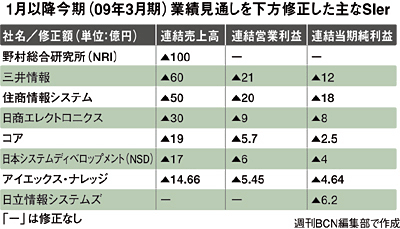 来期については“厳しさが増す”という見方が支配的だ。SIの現場からは、「ユーザー企業自身の来期業績見通しが立たないなかで、IT投資の動向は混迷の度合いを増している」との声が聞かれる。NTTデータは、「増収のめどは立っても、増益を達成できるかどうかは微妙」と明かす。同社は来年度連結営業利益率10%の達成を計画するものの、ユーザー企業からの値下げ圧力が強く、自身の構造改革費用も必要になるなどマイナス要素が大きい。限られたパイを奪い合う状況下で、SI業界の再編は避けられない見込みだ。(安藤章司)