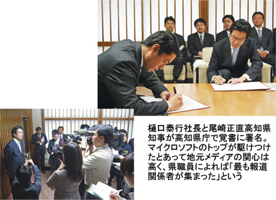 高知県への支援は、マイクロソフトが今年1月30日から始めた「地域活性化協働プログラム」の一環だ。マイクロソフトはCSR活動として過去5年間で約30の自治体のIT化支援を手がけてきた。地域活性化協働プログラムは、それらの経験・ノウハウを集結させ、複数の支援内容を体系化したもの。このプログラムによって大きな効果が見込めそうな自治体をマイクロソフトが選定し、無償で全面支援する。高知県は2番目で、すでに佐賀県と連携済み。同プログラムでは、6月までに5自治体と覚書を締結する計画で、3月下旬に鳥取県、4月に青森県、福島県と続く。景気後退でCSR活動を縮小させる企業が出始めたが、マイクロソフトは逆に活動を加速させている。3月17日に高知県庁で開いた覚書締結式では、マイクロソフトの樋口社長が出席。わずか30分間だったが、トップ自らが出席することで、マイクロソフトのCSR活動に対する意気込みを示した。