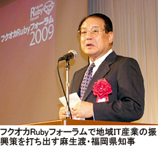 ●「福岡ニューディール」政策始動 福岡県は今年2月、地域経済を振興させるための“16のプロジェクト”を柱とする「福岡ニューディール」政策を発表した。麻生渡・福岡県知事が陣頭指揮を執るもので、水素エネルギーやがんペプチドワクチンなどと並んでRubyによる新しいソフト産業の育成を掲げる。「福岡の情報サービス産業のパラダイムシフトを起こすきっかけになる」(麻生知事)と、積極的な支援策を表明する。