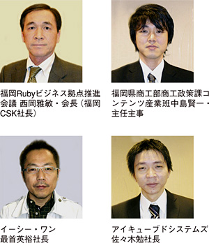 ●産官学連携でRuby活用へ Rubyビジネス・コモンズに集まる若き技術者たちの姿は、地元IT産業界の目にとまることになった。地元有力SIer福岡CSKの西岡雅敏社長は、「どうにかして若いエンジニアの技術力をビジネスに結びつけたい」と考えて、08年8月、福岡Rubyビジネス拠点推進会議を立ち上げた。西岡社長が会長に就き、地元IT有力ベンダーやRubyビジネス・コモンズ、福岡県情報サービス産業協会、地元大学などの企業・団体が加盟。地元IT産業の熱い思いが県を突き動かし、名誉会長には麻生知事、特別顧問には九州経済産業局、福岡市、久留米市、北九州市などが就く。