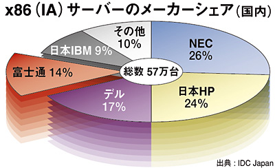 3月30日に開いた記者会見では、サーバー事業の2010年までの目標数値を明確に示した。世界全体では08年の出荷台数27万台、シェア4%(4位)を50万台で10%以上に伸ばす。国内市場では08年の出荷台数8万台、シェア14%(4位)を、20万台・30%に伸ばすという挑戦的な目標だ。とくに国内市場については、新興国に比べて成長力が弱いにもかかわらずかなり強気で、順位を4位から1位に引き上げるというのだ。