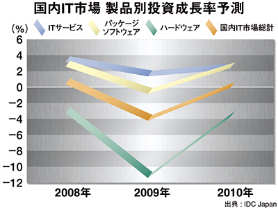 2009年の国内IT市場は、3.8%減の12兆1770億円──。IDC Japanが今年2月のユーザー調査と3月の経済環境を考慮して弾き出した最新数値だ。マイナス成長となるのは、03年以来6年ぶりだ。ユーザー企業のIT投資額も下降気味。同社の調査では、62%の企業が前年度に比べてIT投資額を減少させると回答したという。また、日本情報システムユーザー協会(JUAS)でもIT予算を削減すると答えたユーザー企業が35%に達している。景気後退の影響で、ユーザー企業のIT投資に対する財布の紐はより一層堅くなった。