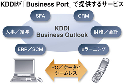 KDDIの「Business Port」は、SaaSによるアプリケーションサービスを通じて、パソコンと携帯電話が連携するための統合プラットフォームとして提供しているもの。アプリケーションサービスをメインにしており、KDDIにとっては回線サービスが収益の柱である通信事業者のビジネスモデルを抜本的に変えるサービスの一つだ。