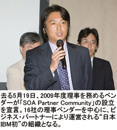 日本IBMと同社のビジネス・パートナー(BP)である国内ITベンダー約70社は5月19日、IBM製品群などを利用したSOA(サービス指向アーキテクチャー)ビジネスを国内で発展・浸透させる協力組織「SOA Partner Community」を設立した。国内の企業システムは、大手を中心にスクラッチ(手組み)開発が多くを占める。しかし、これでは企業システムが複雑化し、運用コストが増えるばかりだ。一方、自社システムの機能を柔軟に変更・追加するニーズは高まっている。日本にSOAビジネスが上陸したのは5年ほど前。「柔軟なシステム」を構築するうえで期待された設計手法だが、依然として浸透度は低い。このため同組織では、参加ベンダー間の開発・販売協力を通じてSOAを普及し、システムの拡販を目指す。本連載は、参加ベンダーの取り組みを主にSOAビジネスの先進事例や課題を紹介する。(谷畑良胤●取材/文)