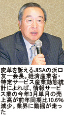 情報サービス産業協会(JISA、浜口友一会長=NTTデータ取締役相談役)は今年度(2010年3月期)、業界全体で前年度比1割程度の売り上げが減る可能性があるとの見方を示した。今年2月の段階では、今期の下げ幅は数%から最悪5%程度としていた。しかし、業界全体で受注が思うように伸びていないことから、当初の予想以上の落ち込みを覚悟する必要があると警鐘を鳴らす。情報サービス産業の産業規模は約17兆円あり、仮に1割下回れば単純計算で1.7兆円分の市場が吹き飛ぶことになる。