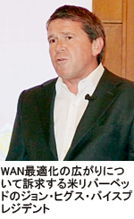 NGNに加え、新興国のNW環境を整備できるとの見方が強いのはWiFi。イベントでは、自社製品が一段と強みを発揮するとアピールしたベンダーもあった。そのベンダーの一例として、WAN最適化製品を主力に据える米リバーベッドテクノロジーが挙げられる。バイスプレジデントでアジア地域を担当するジョン・ヒグス氏は、「少ないコストで高速ブロードバンド化を加速させるのがWANである」と訴える。既存の電話回線を使ったナローバンドでも、WANを使えば若干のリプレースで広域にわたって回線を高速化することができるからだ。