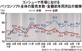 パッケージソフトビジネスが厳しさを増している。今年8月下旬、CD/DVD書き込みソフト「B's Recorder」を開発していたビー・エイチ・エーの自己破産が明るみに出た。コンシューマ向けパッケージソフトの市場全体をみても落ち込みが激しく(図参照)、販売不振は特定企業だけの問題ではない。コンシューマの動向が一定のタイムラグを経てビジネス市場にも波及する経験則からすると、個人・法人の双方でビジネスモデルの変革が強く求められる時だ。