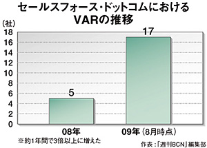 セールスフォース・ドットコム(セールスフォース、宇陀栄次社長)は、チャネル体制を固め、事業拡大を図る基盤を整えた。とくに、自社製品を組み合わせてSaaSを中心とした販売を手がける「VAR(バリュー・アデッド・リセラー)」が1年間で3倍以上に増加。サービス型モデル提供の波が押し寄せているなか、順調に販売網を広げている。
