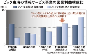 通信やCATV事業を担うグループ会社と05年に合併したビック東海は、情報と通信の融合を推進。ソフトの受託開発からアウトソーシングやクラウド/SaaSなどサービスビジネスへと軸足を移してきた。08年3月期は情報サービス事業の営業利益に占める受託開発の比率がサービス型の2倍以上あったが、これを09年3月期にはほぼ五分五分に。11年3月期には逆転させる方針を打ち出す。収益力の向上をテコに全社の10年3月期の連結売上高は前年度比12.3%増の429億円、営業利益は同13.3%増の51億円を予想。早川博己社長は、「早い段階で営業利益を100億円規模へと倍増させる」と鼻息が荒い。