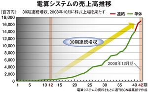 約50人の規模で前年同期比10.7%増、600人近くの人員を投入して同5.5%減──。これは電算システムのビジネスモデルを端的に示した数字である。同社はガソリンスタンドやコンビニの料金収納代行サービスとSIの二本柱で伸びてきた。今年度中間期(2009年1~6月期)では、不況の直撃を受けてソフト開発が落ち込んだものの、サービス型の収納代行は影響を最小限にとどめた。驚くべきは、両事業に従事する人員の差。サービス型は限りなく装置産業に近く、ソフト開発は労働集約的な側面をみせる。