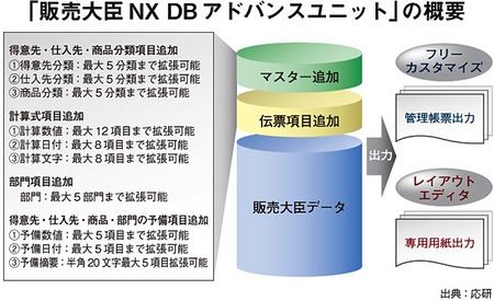 応研(原田明治社長)は、売上・仕入・在庫統合型ソフトウェア「販売大臣NX」の外部接続性やカスタマイズ性能を大幅に拡張した。新たなオプション製品をSIerに提供して製品自体の拡張性を高めたり、他社のWebデータベースとの連携性を強めることで、複雑な販売管理処理をする業種業態や、データを戦略的に活用する中堅・中小企業(SMB)の新規市場を開拓する。ユーザー企業の要望に応じて、「売り手」側で自由度の高い製品を安価に早く提供できるようにする重要性は高まっている。こうした連携性の拡充が、不況下で市場が低迷する業務ソフト販売の“切り札”になるかどうかが注目だ。