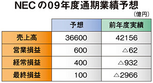 業績悪化は、世界不況が影響しているが、その市場環境のなかで半導体事業の不振をカバーできなかったことが大きい。半導体事業は、営業損益が426億円の赤字(前年同期は6億円の赤字)。不振が続いていることから、同事業の柱である子会社のNECエレクトロニクスをルネサステクノロジと2010年4月に統合し、来年度から実質的に事業から撤退することを発表している。