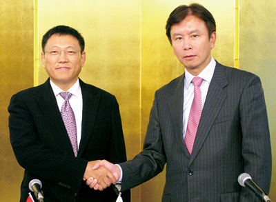 デジタル・チャイナ・ホールディングスの郭為CEO(左)とSJIの李堅社長 中国は、世界同時不況に突入した後にも粘り強く経済成長を続け、IT投資も拡大基調にある。金融や産業、公共、医療などの各方面の大型プロジェクトが相次いでおり、デジタル・チャイナHDは、「中国国内向けのビジネスに集中する」(郭為CEO)と、当面は自ら進んで日本などの海外市場へ打って出ることはないとコメントする。