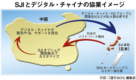 SJIは、デジタル・チャイナHDグループやこの関連会社などから株式の約4割を占める出資を年内をめどに受け入れる。SJIには、SRAホールディングスなども一部出資。今回のデジタル・チャイナHDとの資本業務提携によって、SJIを媒介とした“日本から中国市場へのIT商材の流れ”の形成を目指す。デジタル・チャイナHDの年商は約400億人民元(約5200億円)。日本のITベンダーで喩えるならば、“大手SIerのNTTデータと大手ディストリビュータのダイワボウ情報システムを合算したようなポジションを占める”といわれる。ハード・ソフト商材の販売力と、SI・サービス力の両方を兼ね備えた有力SIerだ。