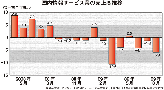 国内情報サービス市場は、大手SIerの下請け層の落ち込みが大きい。野村総合研究所(NRI)は、今年度(2010年3月期)の外注費を前年度比で100億円近く減らす見込み。中堅SIer1社分の売り上げが消える大規模なものだ。JFEシステムズは下期(2009年10月~10年3月期)の外部開発人員の数を前年同期比で約4割削減の見通し。アイティフォーは、この上期、外部の協力会社数を半減させた。