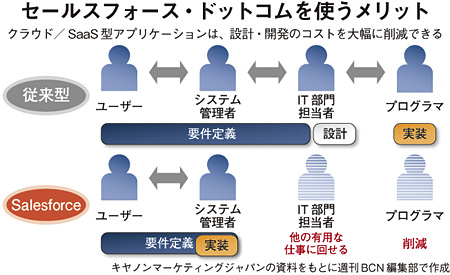 受注を獲得したキヤノンMJは、このユーザーニーズを射止めることで、並み居る大手ライバルを蹴落とした。実は、キヤノンMJ自身、2008年春にSalesforceを全社的に採り入れ、クラウド/SaaSの恩恵を受けている。それだけに、ユーザー視点を理解しやすい。システムを活用し、売り上げや利益を伸ばすことがユーザーにとっての命題。これに対してSIerはとかくシステムの本稼働を“ゴール”に位置づけてしまう傾向がある。それでは「クラウド時代のニーズに応えられない」(キヤノンMJの市川修・流通サービス営業本部第三営業部長)と考える。