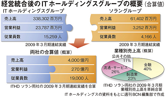 ITHDとソランの昨年度(2009年3月期)連結売上高の単純合算ベースでは、年商4000億円の巨大SIerが誕生することになる。住商情報システムもCSKHDとの資本業務提携の協議を進めており、「本気ではない、ということはない」(中井戸信英会長兼社長)と交渉の進展に意欲を示す。しかし、課題は再編相手の業績やビジネスモデルが必ずしも好調とはいえない点にある。ITHDとソランはともに今年度(10年3月期)減収減益の見通しで、今期ベースの単純合算値は3720億円にとどまる。ITHDの岡本晋社長は、「一過性のもの」と、4000億円規模の実力をもつことに変わりないと鼻息が荒い。