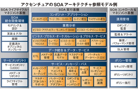 アクセンチュアには、通信や電力、ハイテク、製造、金融などの大手企業に対するシステム構築で活用しているSOA基盤が備えるべき機能をパターン化した参照モデル「SOAリファレンスアーキテクチャフレームワーク」がある。「SOAをデザインし導入する際の“鑑”となるアーキテクチャフレームワーク」(立花氏)で、これを参照しながら既存製品やサービスをマッピングすれば、包括的なITシステムを短期間で構築が可能だ。このフレームワークをSPCのSOAビジネスを拡大する活動に生かしていく。