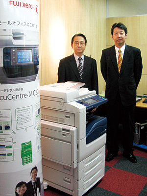 富士ゼロックス(山本忠人社長)は、販社などのニーズを反映して、まったく新しく開発し、2009年12月中旬に発売したA3カラー小型デジタル複合機(MFP)の新製品を引っ提げ、中・小規模企業向けの毎分11~20枚市場で国内シェア1位を狙う。同社は、大手・超大手市場で高いシェアを獲得している。だが、中小領域ではとリコーとキヤノンの後塵を拝しているのが実状だ。直系販社だけでなく、既存特約店の営業展開を活性化し、新製品だけで年間4万台の販売台数を目指す。上位2社にどこまで迫れるかが要注目だ。