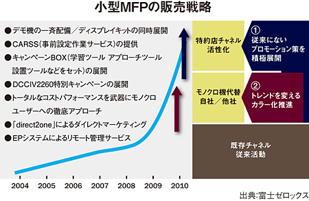 しかし、リコーとキヤノンの牙城は、そう簡単には崩せない。そこで、富士ゼロックスでは、これまでにないマーケティング戦略に打って出る。2010年3月までに同新製品を販売した販社に対し、インセンティブを割増しで提供し、早期需要を取り込むほか、直系販社や特約店のギャラリーにデモ用の実機や機能を説明する2m近くある筒型のPOPを配備するなど、「従来にないプロモーションを積極化し、既存チャネルを活性化させる」(天野チーム長)。さらには、地域で活躍するSIerや他社機を売る事務機ディーラー、通信系販社をターゲットに新規チャネルの獲得も行う計画だ。