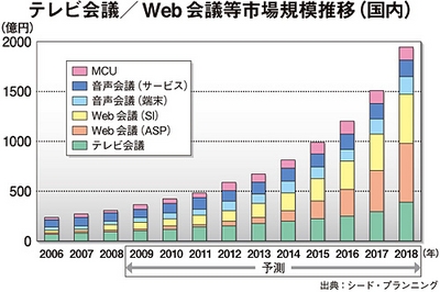調査会社のシード・プランニングによれば、テレビ会議/ウェブ会議の国内市場は拡大傾向にある。市場規模は2006年に209億円、08年に315億円。13年に08年の2倍以上となる675億円まで伸び、18年に1956億円に達すると予測している。