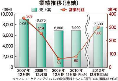 キヤノンMJの09年12月期の連結売上高は、前年度比17.0%減の6866億円、営業利益は同75.2%減の63億円と大幅にダウン。数年前は年商1兆円に迫る勢いだったのが嘘のようだ。営業利益ベースで見ると、複合機やSIなど主力のビジネスソリューションセグメントは33億円の赤字、製造業の投資抑制の逆風が吹き荒れる産業機器も11億円の赤字。デジカメなどコンシューマ機器の販売が、前年度比5%増の107億円の黒字だったため、全社ベースでの赤字転落を辛くも逃れた格好だ。