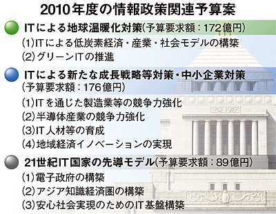 経済産業省の2010年度情報政策関連施策・予算が明らかになった。「エコ」「中小企業・地域活性化支援」「先端IT国家の推進」がポイントで、09年度に比べて約35億円積み増した430億円規模の予算を国会に要求する予定だ。来年度、新たに始める新規事業を中心に、主な施策を解説する。注目はクラウドコンピューティング関連施策だ。