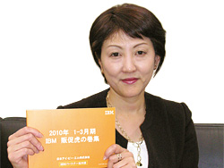 | 古長由里子部長。手に持つのは2010年1~3月期の「IBM販促虎の巻集」。IBMパートナー以外の社外秘。最新の販促ノウハウを100ページ余りにまとめたもの。昨年同期の印刷部数は1000部程度だったが、徐々に引き合いが増加し、同最新号は6000部印刷するまで拡大している |