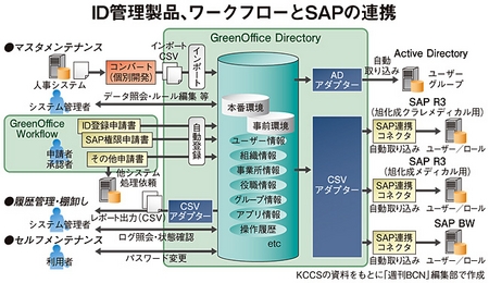 同社は、SAPと京セラコミュニケーションシステムのID管理システム「GreenOffice Directory」とワークフロー「GreenOffice Workflow」を導入。ID管理とSAPを連携させることにより、社内システムとアクセス権限を一元管理できるようにした。これにより、煩雑だったID管理を簡素化することができた。SAPを利用するためのID発行申請のように、紙ベースで行っていた申請業務をワークフローシステムによりIT化することで、出張旅費申請、パソコン購入申請など、多岐にわたる申請業務を効率化。申請・承認のトレーサービリティを確保し、監査証跡としての利用できるようになった。