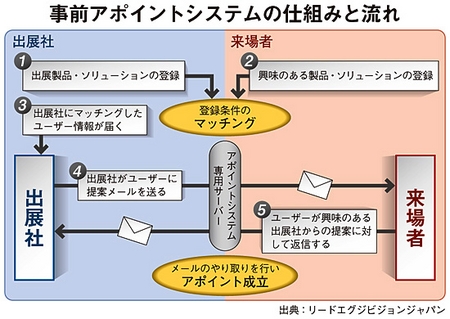 このシステムは、来場者が自社で導入したい製品や抱えている課題を事前に登録。条件に合った出展企業が、その来場者に対して提案メールを送るという仕組みになっている。来場者は、関心があればメールをやり取りすることで出展企業とブースなどでアポイントが取れるほか、探したい製品やサービスの展示を事前に把握できるため、会場巡回の効率化を図ることができるようになる。また、出展企業とメールをやり取りする際、聞きたいポイントなどを出展企業に知らせておくこともできる。出展企業にとっては、各来場者に合わせた提案書やデモなどを用意できるという利便性がある。