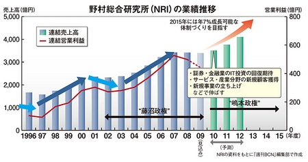 金融や流通など強みをもつ業界では、ITソリューションの部門そのものに業務ノウハウが蓄積されているため、コンサルの比重はそれほど大きくなくても済む。だが、SI実績がまだ少ない産業分野や海外市場では、コンサル部門との連携が欠かせない。中国では、コンサルをメインとするNRI上海のビジネスが先行し、SIが主軸の「NRI北京が少し遅れて後を追う」(藤沼会長兼社長)構図だといい、海外でも両事業のより密な連携が課題になっている。産業分野の開拓とグローバル事業の伸展などによって、売り上げ年7%成長、営業利益率15%の収益基盤を2015年までにつくる高い目標を掲げるNRI。再び高成長、高収益の体制に戻せるかどうか──。“嶋本新政権”の手腕に期待が高まる。