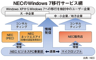 大企業向けには、NECの検証センター「PEC」を通じてOS移行サービスを提供。中規模企業向けには、NECネッツエスアイがコンサルティングを含めた「Windows 7」の導入支援サービスをメニュー化している。「NECグループで取り組んできた実績や経験を生かしていく」という狙いだ。厳しいといわれるPC販売を回復できるか否かは、このようなNECの支援強化により、販社の販売意欲が高まるかどうかにかかっている。(佐相彰彦)