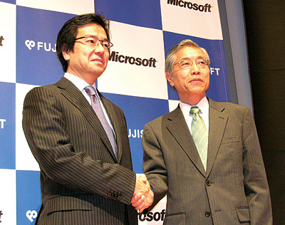 富士ソフトの白石晴久社長(右)とマイクロソフトの樋口泰行社長ががっちりと握手