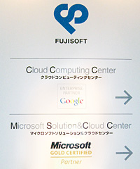 マイクロソフトの樋口社長は、「多くのパートナーのなかで、真剣に考え、それに見合う投資をしてくれるパートナーと、そうでないパートナーと、実際には濃淡がある」と明かしたうえで、「富士ソフトは高い目標を掲げ、投資もしてくれている」と評価。富士ソフトは、実に熱烈なアプローチをする一方で、今回開設した「マイクロソフトソリューション&クラウドセンター」の隣には、競合するGoogle系のクラウドサービスを展示する「クラウドコンピューティングセンター」を、ちゃっかりと開設している(写真参照)。どちらを選ぶかは“顧客に決めさせる”というしたたかなスタンスだ。