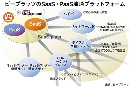 SaaS/PaaSの担ぎ手である販売店に対して「MySaaS」と呼ぶ専用ストア・管理機能を提供するとともに、SaaS利用顧客と販売店の対応、請求・課金業務といった販売管理をビープラッツが担う。SaaSベンダーは、ビープラッツと契約するだけで、ネットワールド、ダイワボウ情報システム、ハイパーの大規模な商流を、自社の販路としてもつことができる。ビープラッツの基盤を利用して、SaaSを売るための販売店用の仕組みを、ダイワボウ情報システムでは「iDATEN(韋駄天)SaaS」、ネットワールドでは「NwaaS(Networld as a Service)」というブランドで提供している。販売店は無料でビープラッツの基盤を利用できるだけでなく、成約すれば年10%の取次料が入ってくる。