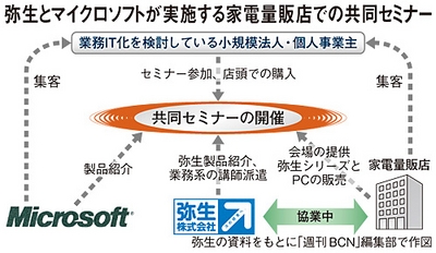 今回の協業は、弥生の取引先である家電量販店のセミナー室を借りるなどして、公認会計士などを講師に招き、業務へのIT利活用の啓発活動を行うことなどから開始する。弥生の岡本社長は「まずは、とても地道な活動が主になる」と、“特効薬”はないとしたうえで、トップメーカーでありながら「1社では限界がある。マイクロソフトのリソースと知恵を借りる」(同)と、従業員20人未満の企業に対する取り組みに手詰まり感があることを認める。