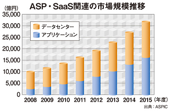 ASPICの調査資料『ASP・SaaS白書2009/2010』によれば、ASP・SaaS関連市場規模は、2年後の2012年に2兆円に到達。15年には3兆円に達すると予測している(図参照)。内訳をみると、これまではSaaSを提供するためのインフラ系投資額(図では「データセンター」)が圧倒的に大きかったが、今後はインフラで動くアプリケーションが伸びるとみている。15年には、その比率はほぼ同じになる。