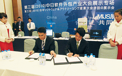 両団体の幹部が今年1月に成都市内で会談し、4月19~21日に開催された「第8回中国国際ソフトウェア博覧会」のなかのイベント「中日ソフトウェアアウトソーシング産業大会」において覚書を交わすことを決め、19日、両団体の代表者が出席し、調印式を行った。