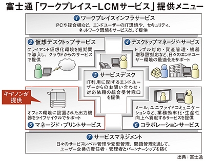 これまで日本の企業では、世界に比べてマネージド・サービスのニーズが高まっていなかった。ところが、リーマン・ショック以降、コスト削減や運用負担を軽減する目的で、同サービスへの注目度が高まることとなった。そこでキヤノンはまず、このCanon MDSを国内で波及させるために富士通と提携し、同社のIT資産をトータルにサポートする「ワークプレイス-LCMサービス」を組み合わせて、主に大企業への提供を本格化させたわけだ。