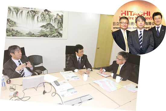 写真左から、森保治・日立信息系統(上海)北京支社軟件事業部事業部長、阿部淳・日立製作所ソフトウェア事業部副事業部長、奥田喜久男(本紙主幹)